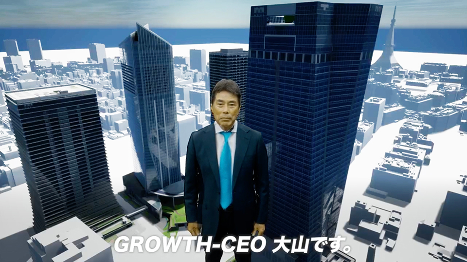 ADKグループが本社を置く虎ノ門ヒルズの3DCGデータを配置したバーチャル空間を制作。巨大化(グロース)した代表取締役社長グループCEOの大山 俊哉様がバーチャル空間から入社を祝う特別映像に仕上がりました。