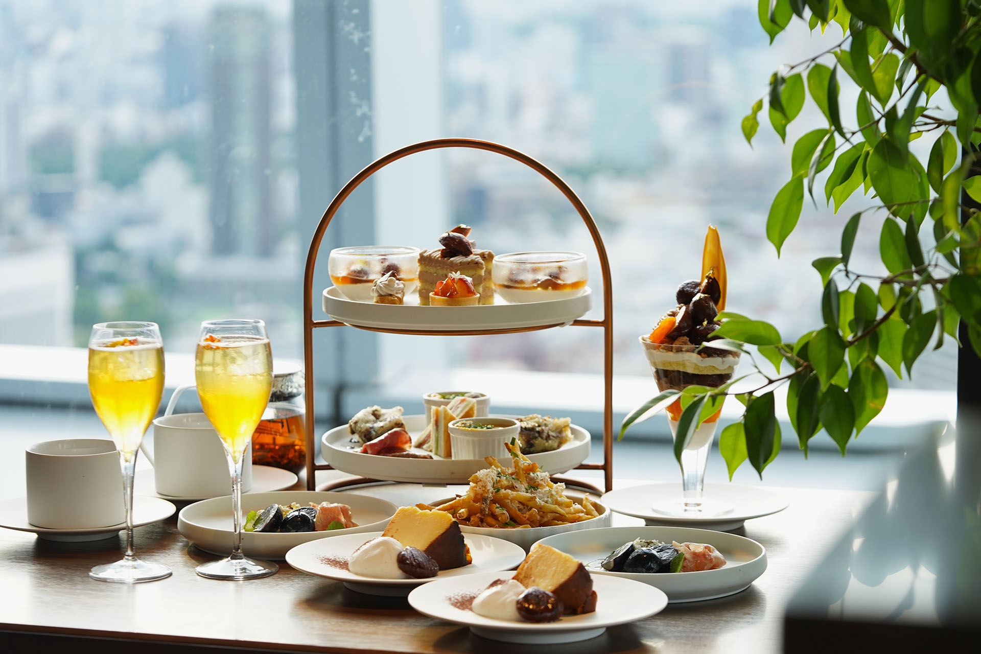 芳醇な栗を主役に、林檎やサツマイモ、和梨、舞茸など、旬の恵みを贅沢に取り入れたスイーツとセイボリーをご用意しました。系列店でも人気を博す“バスクチーズケーキ”は、この季節だけのマロンシャンティクリーム仕立て。しっとり濃厚な味わいと栗のまろやかさが重なり合う、ここでしか味わえない特別な一皿です。ティーセレクションは、紅茶専門店「Uf-fu TOKYO」より厳選。ダージリンやアールグレイに加え、秋を感じるブレンド「オトンヌ」なども揃えました。スパークリングワインや季節のカクテルなどアルコールも含め、秋の午後をゆったりとお楽しみいただけます。
